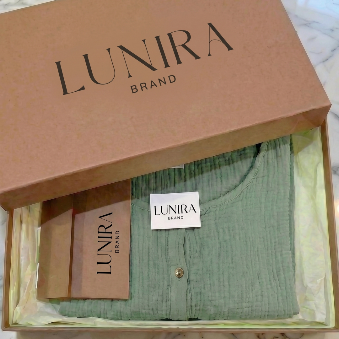 Each piece of clothing comes in a Lunira Brand eco-friendly packaging. We also include free stickers with every order!